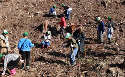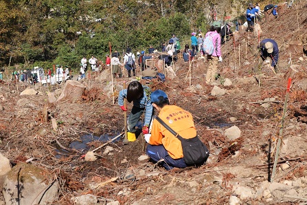 その後、参加者はヤマモミジとヤマザクラの苗木、計500本を植樹し、「環境が今より良くなりますように」や「(水源地域への感謝を込めて)ありがとう」などと書いた『木のプレート』を苗木に掛けていました。作業後には、地元の味『だご汁』と『おにぎり』がふるまわれ、参加者は自然の中で和やかな昼食のひとときを楽しみました。