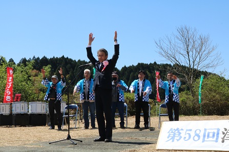 山開きは、藤蔭(とういん)高等学校吹奏楽部による華やかな演奏によるオープニングに始まり、山の安全を祈願する神事が行われ、式典では椋野市長をはじめ来賓の方々から、「この地域が筑後川の水源であり、水源を守ることの重要性を知っていただき、自然豊かな前津江に多くの人に来ていただきたい」などの挨拶がありました。