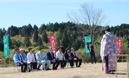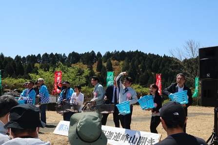 日田市前津江村の「スノーピーク奥日田キャンプフィールド横(旧椿ヶ花ハイランドパーク)」にて、第58回津江山系釈迦連峰山開(つえさんけい しゃかれんぽう やまびら)きが、山祭会議の主催により開催されました。椋野 美智子 (むくの )みちこ)日田市長や、大分選出の衆議院議員、大分県議会議員、日田市議会議長のほか、地元の方々や登山者など、多くの人が来場され、当企業団からも名古屋企業長及び2名が参加しました。