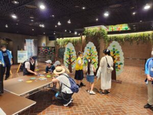 高校生たちが、来街者に声をかけて、趣旨を説明し、葉型のカードに筑後川へのありがとうのメッセージを書いてもらえるように案内しました。感謝の言葉があふれたカードを木型のパネルの好きな場所に貼り付けていくことも好評で、たくさんのメッセージでパネルの木が見る見るうちに茂っていきました。